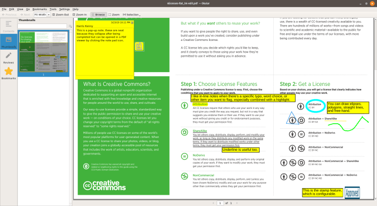 Here’s a simple demonstration of the review tools within Okular, using a freely licensed PDF from Creative Commons about their six licenses for sharing work. Screen shots shown running on Pop!_OS Linux in Okular Version 1.3.3.