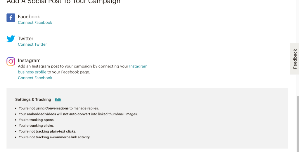 I looked to see if there was an easy way to disable tracking in Settings at the account level in MailChimp but I couldn’t find it. This appears to be controlled on a per-campaign basis which makes this a manual process. It’d be nice if they offered a universal way to toggle off tracking. Or if they already do, please let me know.