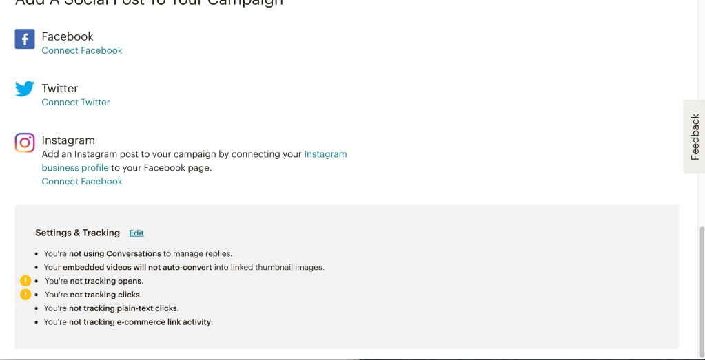 Interesting, MailChimp seems actively concerned about the fact that we’re not using tracking! Check out these warning icons.