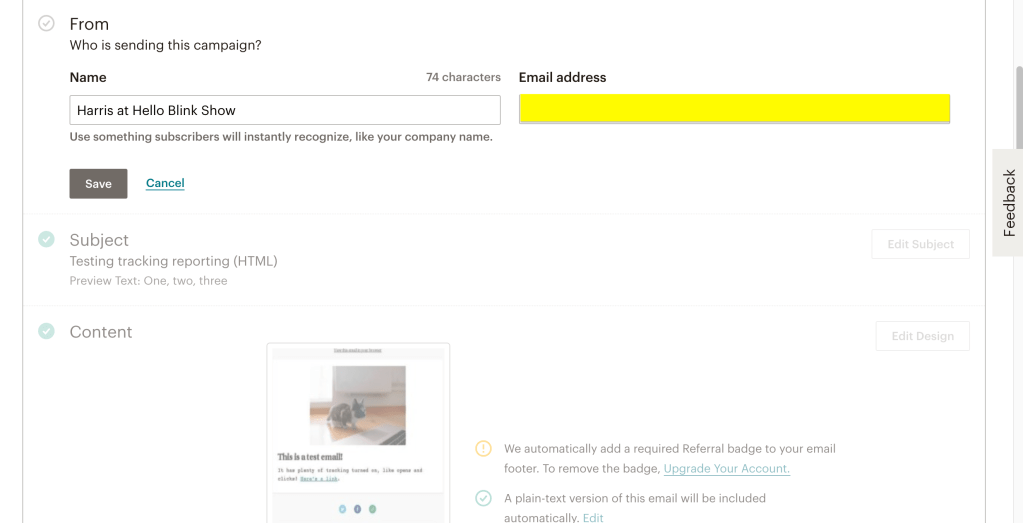 First I tried changing the email that the campaign is sending from, while maintaining the same sender name. Next, I tried changing the name that the campaign is sending from, while maintaining the same email address.
