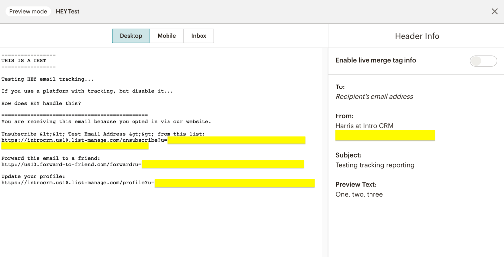 For now, let’s start with verifying that the Spy Tracking feature works. If we disable all tracking, what does it look like in HEY? MailChimp let’s you send Plain-text emails, they don’t load any images or any tracking.
