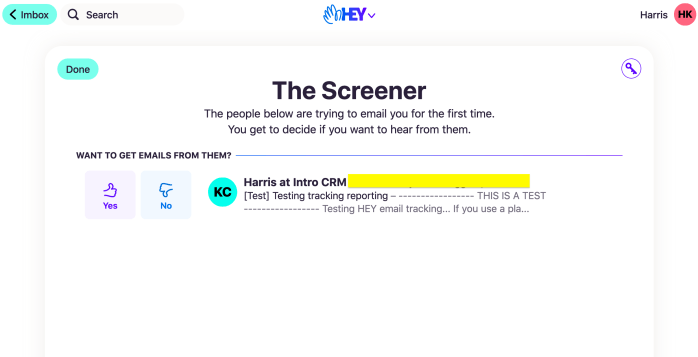 - This is the first email from this recipient, so it worked and was caught by The Screener.