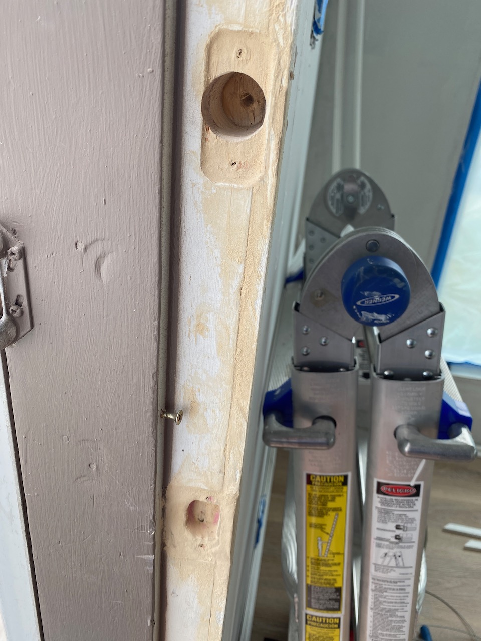 The door hardware wasn’t in good shape. The surface on the door knob was worn down, the hinges were a different finish, and there wasn’t any sort of door stop. There were also gaps in the door frame from a previously botched lock install.