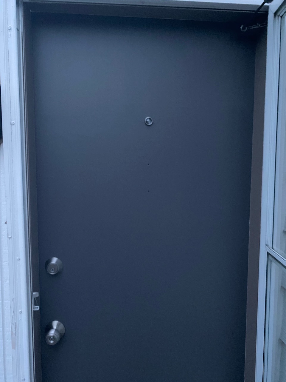 I’m planning on using this as a formal office, so I decided to have fun with it by installing an eye viewer and door knocker (pictured below). I also bought numbers for a half address that I’ll put up later. (The outside needs touching up, too.)