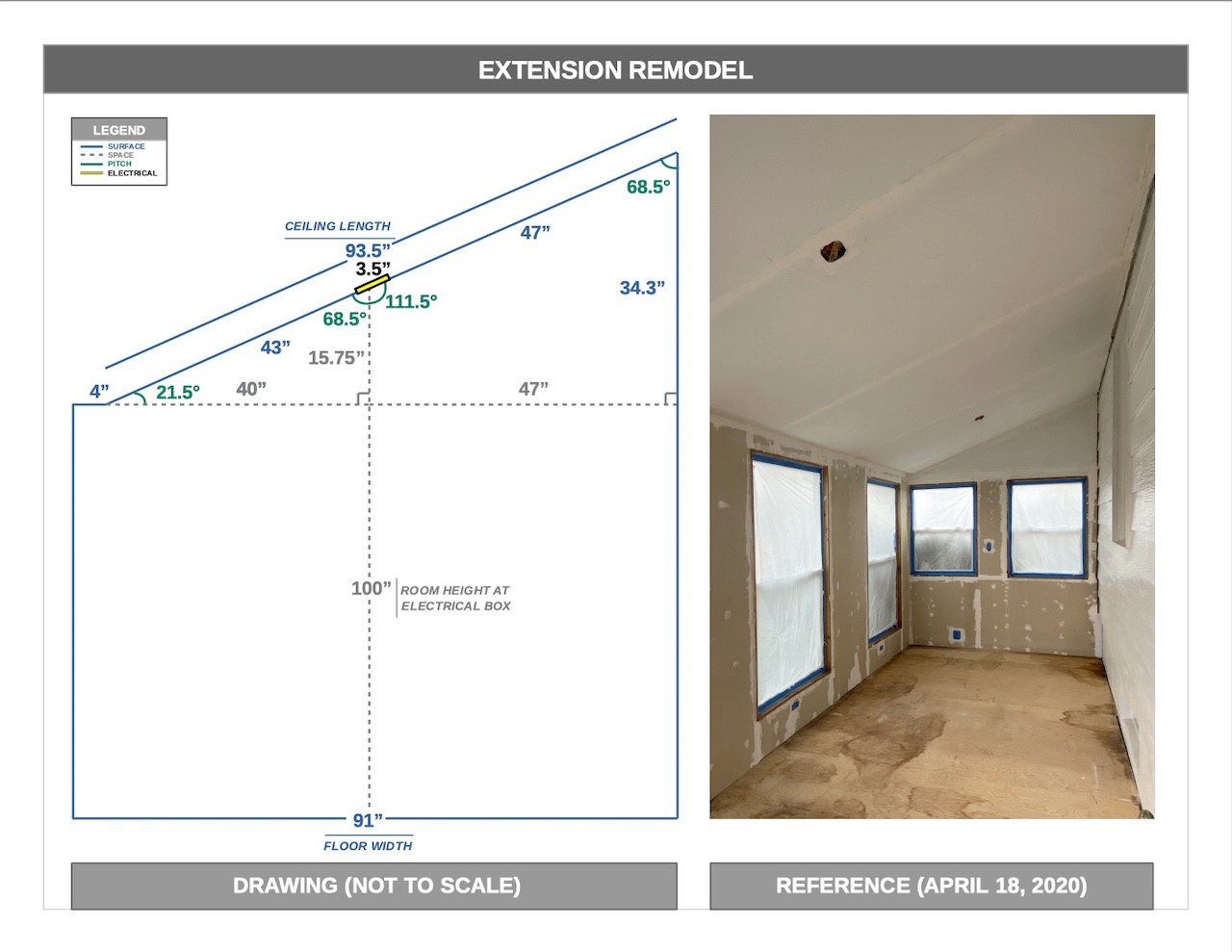 Here’s where I got a little out of hand. I wanted to make sure that the ceiling fan would work with the ceiling pitch. I rediscovered geometry and went to town. I had a licensed electrician install the fixtures and add a hardwired smoke detector (not pictured).